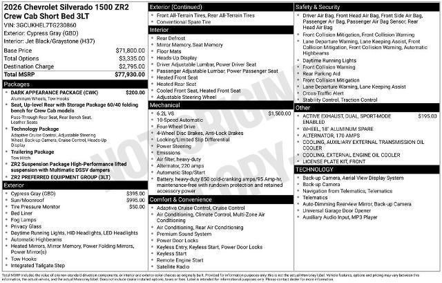 Price does not include tax, title, license, or administration fees. Price does include: $2,500 - Exp. 02/22/2026 2026 Chevrolet Silverado 1500 ZR2 Cypress Gray 4WD 10-Speed Automatic EcoTec3 6.2L V8