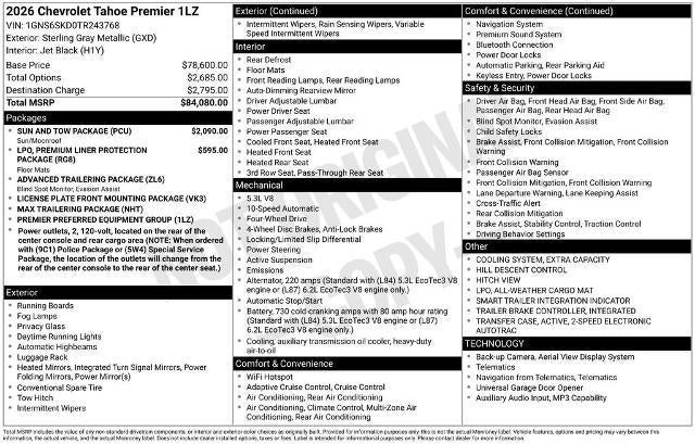 2026 Chevrolet Tahoe Premier Sterling Gray Metallic 4WD 10-Speed Automatic with Overdrive EcoTec3 5.3L V8Recent Arrival!NO GIMMICKS, NO HOOKS, NO SPECIAL HOOPS TO JUMP THROUGH, just real pricing. Price does not include tax, title, license, or $599 administration fee. While we make every attempt to ensure pricing accuracy. Dealer not responsible for computer or human error or added Accessories . Not included in internet price. Dealer reserves the right to charge appropriate price for dealer installed accessories installed prior to delivery. Dealer reserves the right to change prices due to human or computer error.
