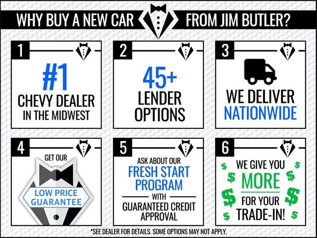 Come see why we are the #1 Chevrolet dealership in the Midwest. On top of that we have also been awarded Dealer of the year the last 8 years. Proudly serving: St. Louis, South County, Webster Groves, Creve Coeur, Kirkwood, Maryland Heights, Sullivan, Rolla, Columbia, Fenton, Chesterfield, St. Charles, Kansas City, Springfield, Jefferson City, and all of great Missouri and Illinois. While we make every attempt to ensure pricing accuracy. Dealer not responsible for computer or human error, dealer reserves the right to change prices due to human or computer error. In order to put a 24 hour hold deposit on vehicles, Financing must be secured thru Jim Butler Chevrolet Business Office and Cash Deals must be Electronically Transferred within Six Hours. Interior Protection Package (Front and Rear Jet Black All-Weather Floor Liners and Jet Black Cargo Liner), License Plate Front Mounting Package, Preferred Equipment Group 1SA, 2-Way Adjustable Front Head Restraints, 2-Way Power Driver Lumbar Seat Adjuster, 3.50 Final Drive Axle Ratio, 4-Way Manual Front Passenger Seat Adjuster, 4-Wheel Disc Brakes, 6 Speakers, 6-Speaker Audio System Feature, 8-Way Power Driver Seat Adjuster, ABS brakes, Air Conditioning, Alloy wheels, AM/FM radio: SiriusXM, Auto High-beam Headlights, Automatic temperature control, Brake assist, Bumpers: body-color, Compass, Delay-off headlights, Driver door bin, Driver vanity mirror, Dual front impact airbags, Dual front side impact airbags, Electronic Stability Control, Emergency communication system: OnStar One Essentials, Evotex Seat Trim, Exterior Parking Camera Rear, Front and Rear Custom Molded Splash Guards, Front anti-roll bar, Front Bucket Seats, Front Center Armrest, Front reading lights, Front wheel independent suspension, Fully automatic headlights, Heated door mirrors, Heated Driver and Front Passenger Seats, Heated front seats, Heated steering wheel, Illuminated entry, Leather steering wheel, Low tire pressure warning, Occupant sensing airbag, Outside temperature display, Overhead airbag, Overhead console, Panic alarm, Passenger door bin, Passenger vanity mirror, Power door mirrors, Power driver seat, Power steering, Power windows, Premium audio system: Chevrolet Infotainment 3, Radio data system, Radio: AM/FM Stereo Audio System, Rear window defroster, Rear window wiper, Remote keyless entry, Security system, SiriusXM Trial Subscription, Speed control, Split folding rear seat, Spoiler, Steering wheel mounted audio controls, Tachometer, Telescoping steering wheel, Tilt steering wheel, Traction control, Trip computer, Variably intermittent wipers, Wheels: 18 Black-Painted Aluminum, and Wireless Apple CarPlay/Wireless Android Auto.
